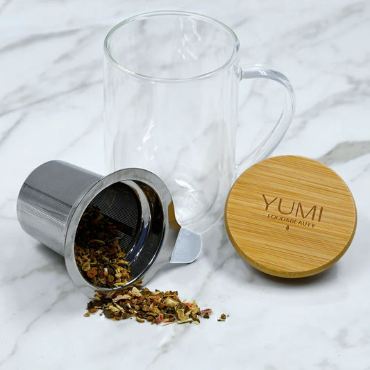 Tasse verre double paroi avec infuseur & cuillère doseuse bois